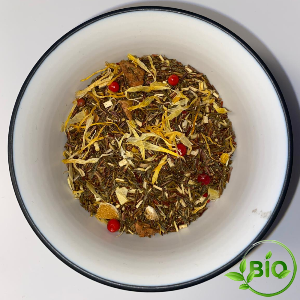 Délicieux mélange de rooibos vert aux goût de pêche de vigne fine et douce avec des morceaux de pommes et fleurs de souci.