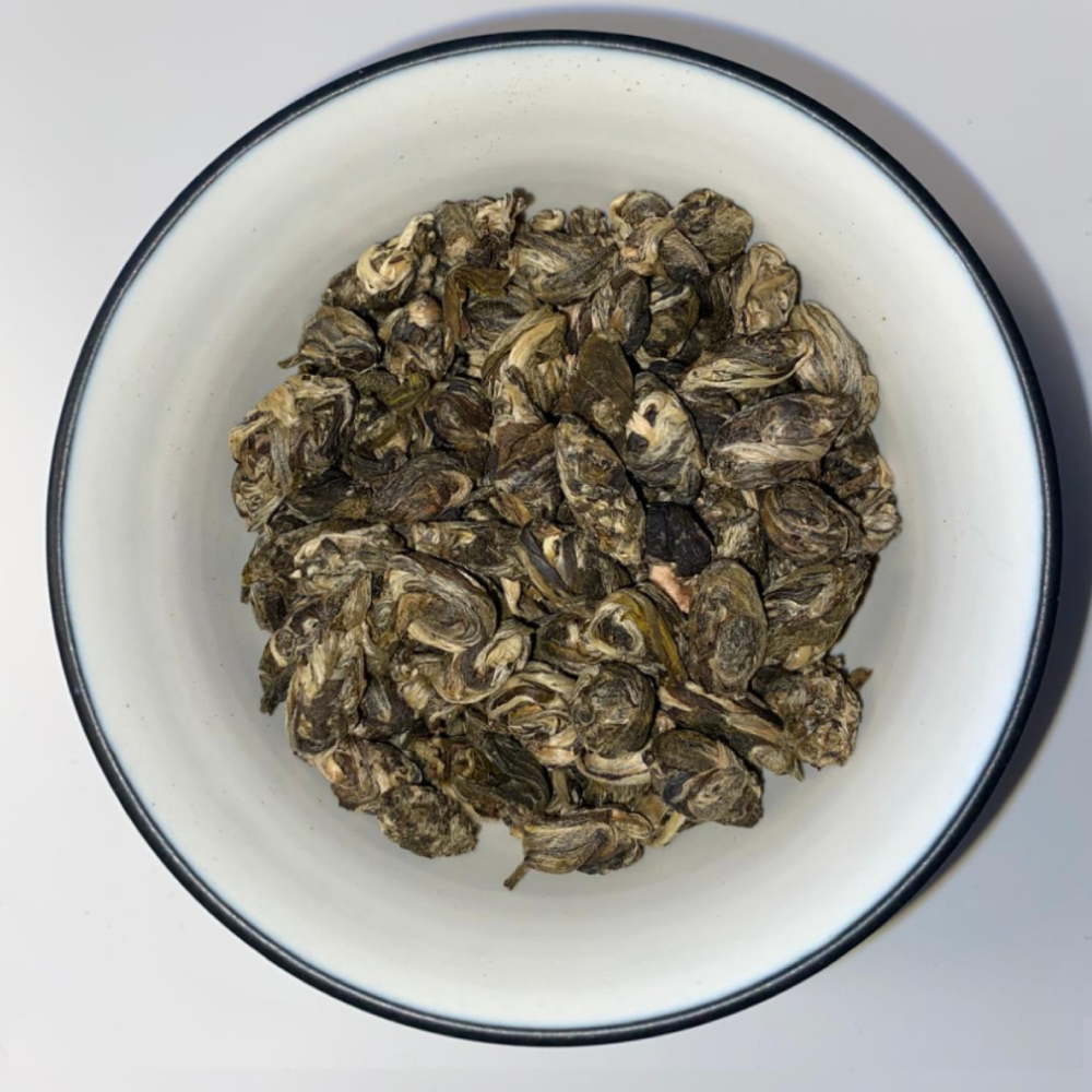 Les meilleurs bourgeons de thé vert ont été façonnés en petites perles et parfumés à 7 reprises avec des fleurs fraîchement cueillies. Le must du thé au jasmin.