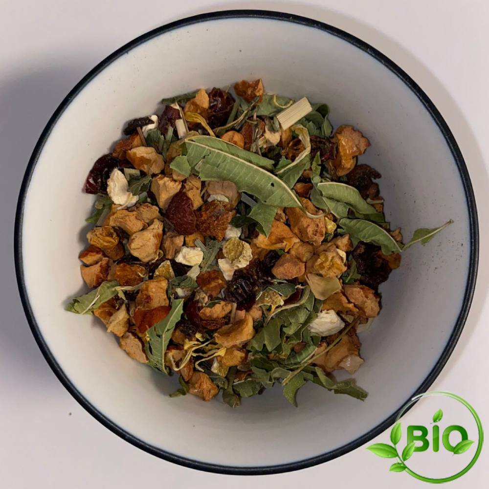 Délicieux mélange composé de morceaux de pommes, d'écorces d'orange, de mélisse, citronnelle, fleurs de tilleul, bouton de roses, verveine citronnée, arôme naturel de pamplemousse, huile d'orange et fleurs de souci.